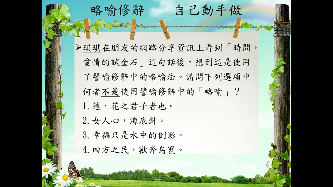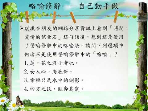 載入中... 相關課程 Back 修辭[七]/譬喻 相關課程 0 / 750 登入觀看 ⇐ Use this menu to view and help create subtitles for this video in many different languages. You'll probably want to hide YouTube's captions if using these subtitles. 修辭[七]/譬喻 上傳學習單 下載學習單