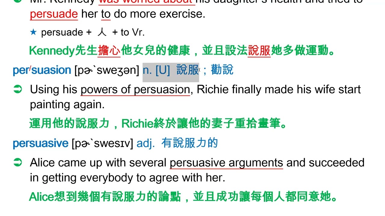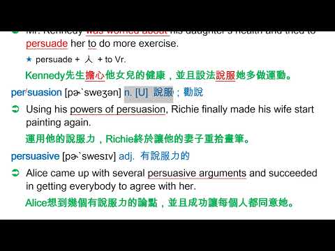 載入中... 相關課程 Back persuade [pɚ`swed] vt. 說服;勸說 相關課程 0 / 750 登入觀看 ⇐ Use this menu to view and help create subtitles for this video in many different languages. You'll probably want to hide YouTube's captions if using these subtitles. persuade [pɚ`swed] vt. 說服;勸說 上傳學習單 下載學習單