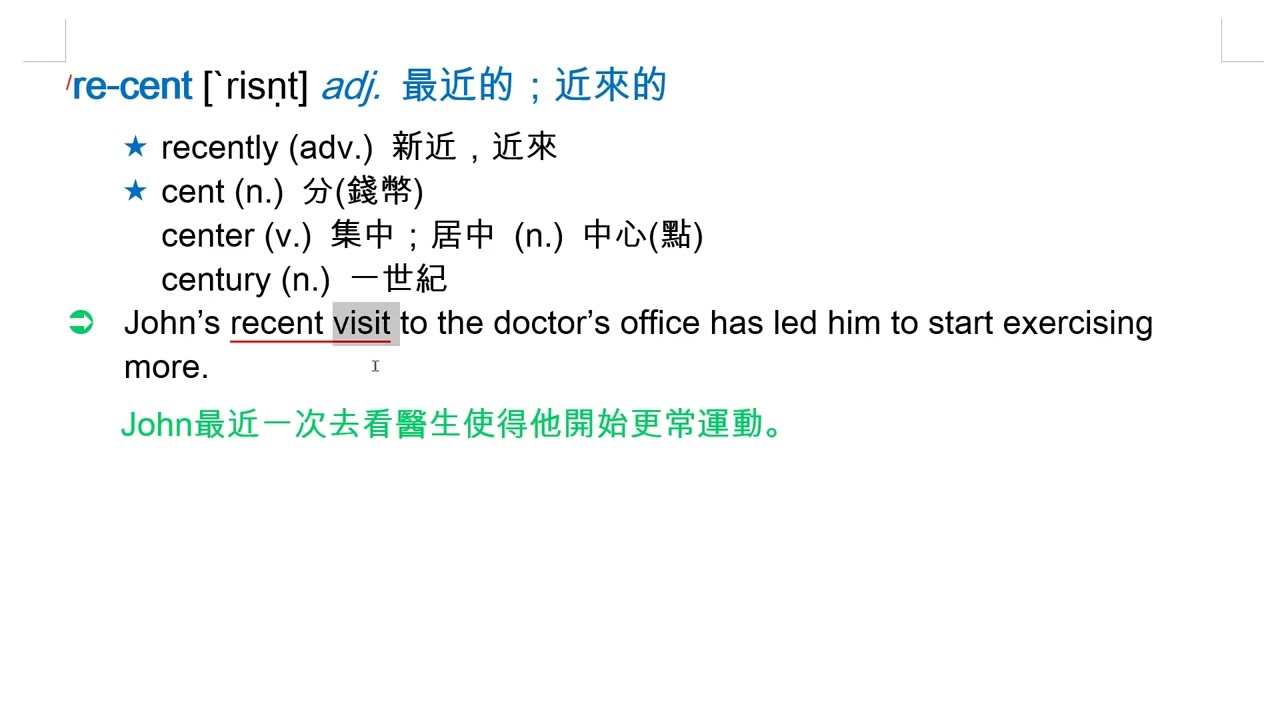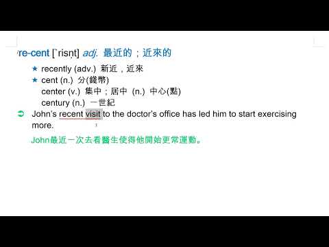 載入中... 相關課程 Back recent [`risṇt] adj. 最近的;近來的 相關課程 0 / 750 登入觀看 ⇐ Use this menu to view and help create subtitles for this video in many different languages. You'll probably want to hide YouTube's captions if using these subtitles. recent [`risṇt] adj. 最近的;近來的 上傳學習單 下載學習單