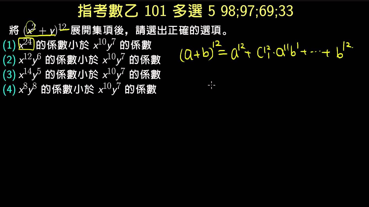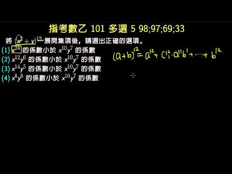 載入中... 相關課程 Back 【數乙】101 多選5 二項式展開 相關課程 0 / 750 登入觀看 ⇐ Use this menu to view and help create subtitles for this video in many different languages. You'll probably want to hide YouTube's captions if using these subtitles. 【數乙】101 多選5 二項式展開 上傳學習單 下載學習單