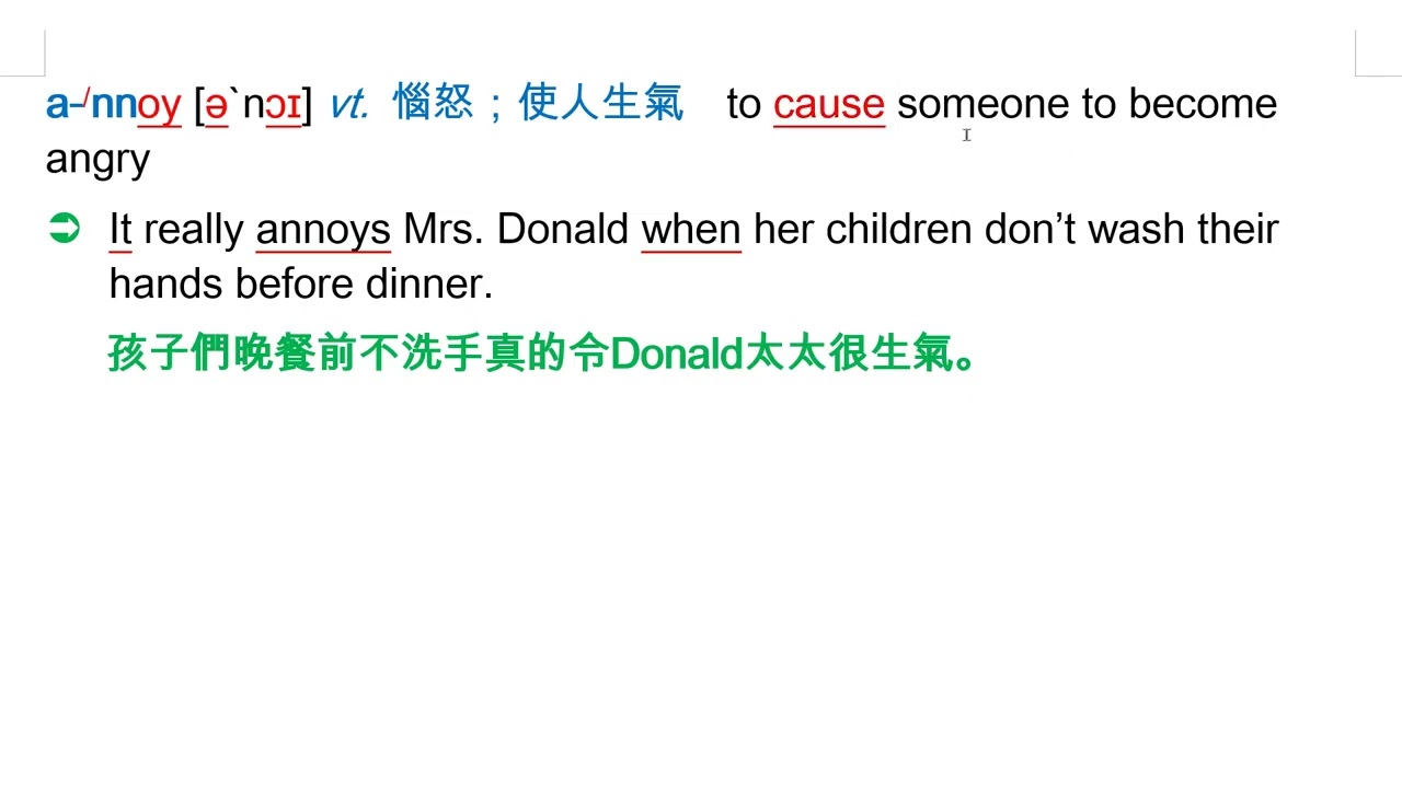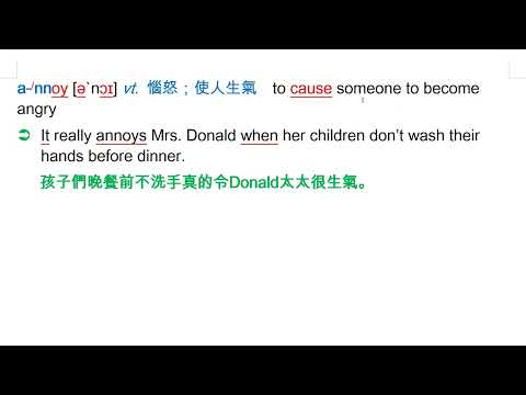 載入中... 相關課程 Back annoy [ə`nɔɪ] vt. 惱怒;使人生氣 相關課程 0 / 750 登入觀看 ⇐ Use this menu to view and help create subtitles for this video in many different languages. You'll probably want to hide YouTube's captions if using these subtitles. annoy [ə`nɔɪ] vt. 惱怒;使人生氣 上傳學習單 下載學習單