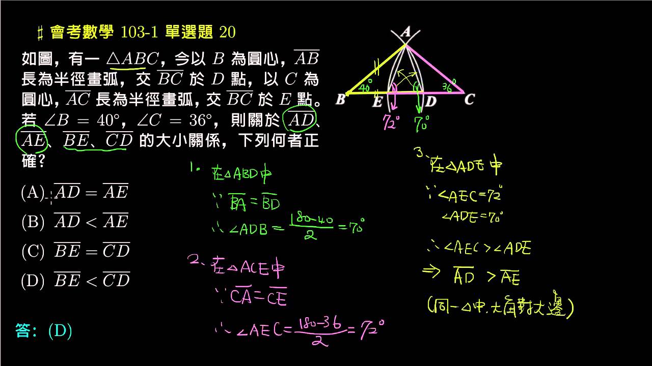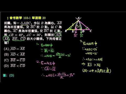 載入中... 相關課程 Back 【會考數學】103v1 單選20:大角對大邊 相關課程 0 / 750 登入觀看 ⇐ Use this menu to view and help create subtitles for this video in many different languages. You'll probably want to hide YouTube's captions if using these subtitles. 【會考數學】103v1 單選20:大角對大邊 上傳學習單 下載學習單
