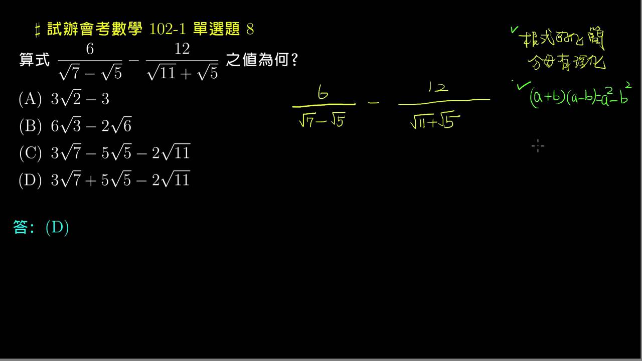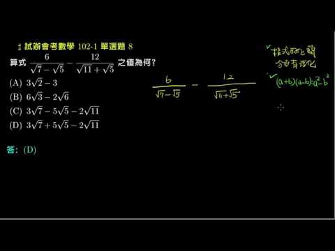 載入中... 相關課程 Back 【試辦會考數學】102 單選08:根式的化簡(分母有理化) 相關課程 0 / 750 登入觀看 ⇐ Use this menu to view and help create subtitles for this video in many different languages. You'll probably want to hide YouTube's captions if using these subtitles. 【試辦會考數學】102 單選08:根式的化簡(分母有理化) 上傳學習單 下載學習單