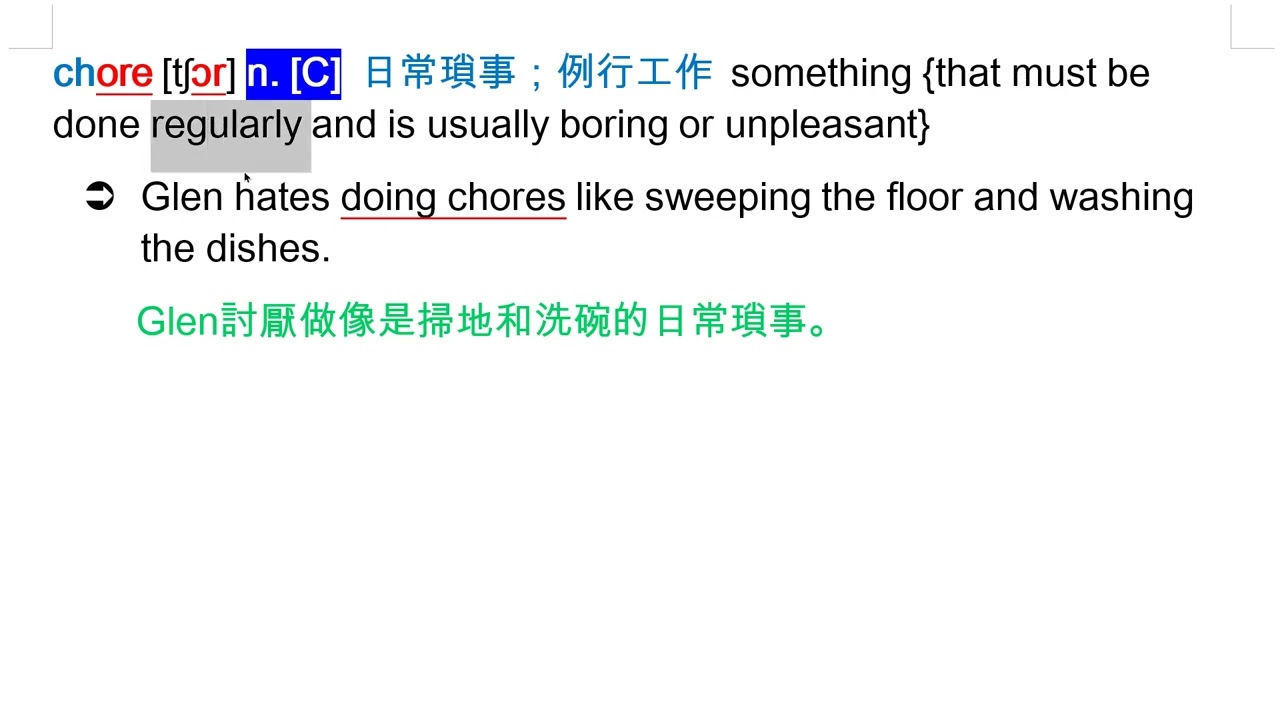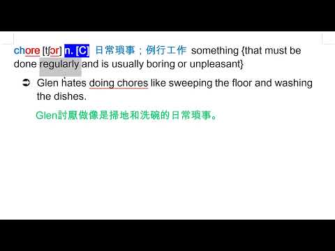 載入中... 相關課程 Back chore [tʃɔr] n. [C] 日常瑣事;例行工作 相關課程 0 / 750 登入觀看 ⇐ Use this menu to view and help create subtitles for this video in many different languages. You'll probably want to hide YouTube's captions if using these subtitles. chore [tʃɔr] n. [C] 日常瑣事;例行工作 上傳學習單 下載學習單