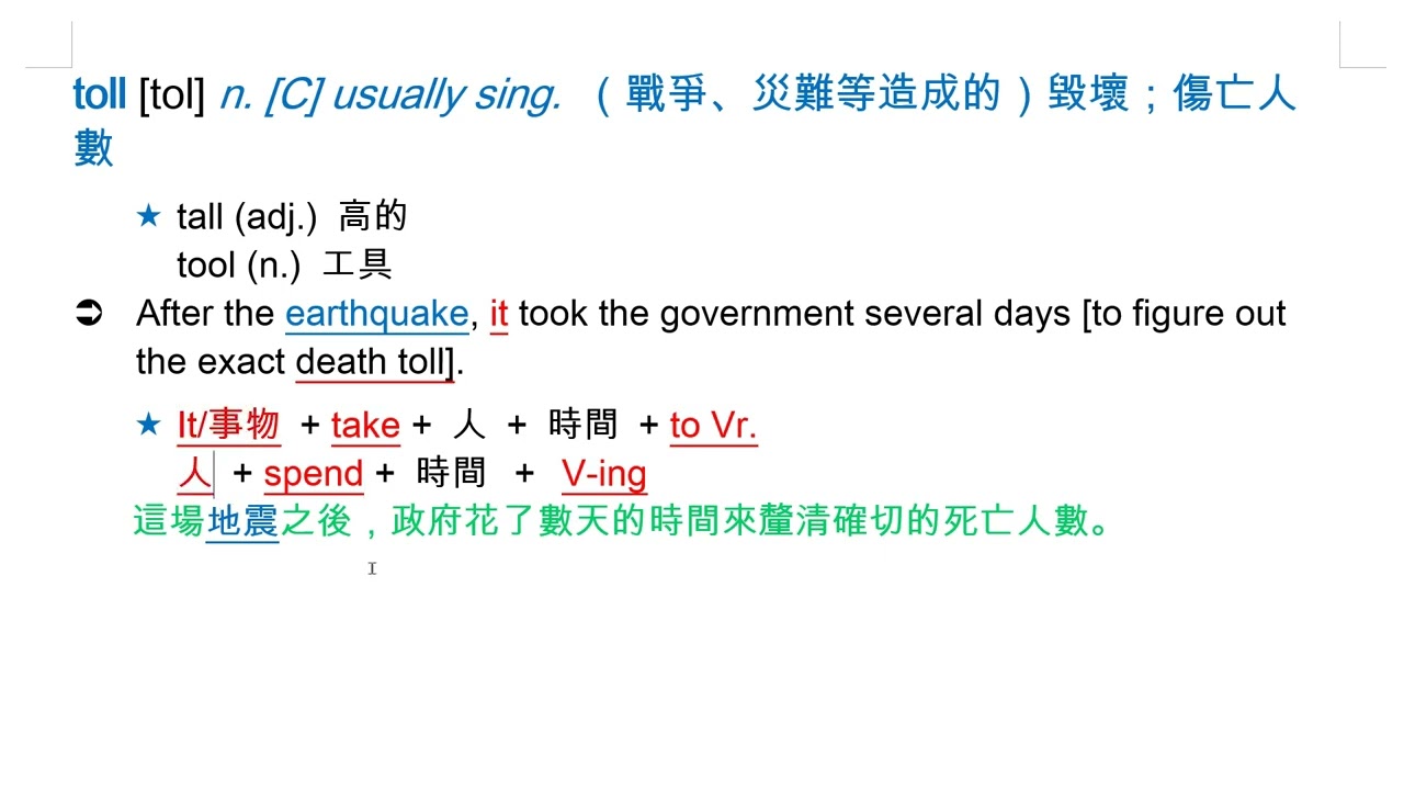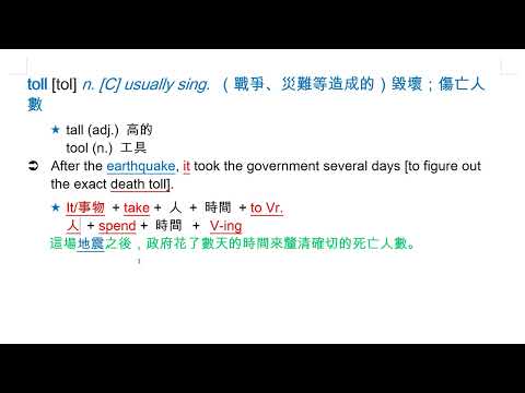 toll [tol] n. [C] usually sing. (戰爭、災難等造成的)毀壞;傷亡人數