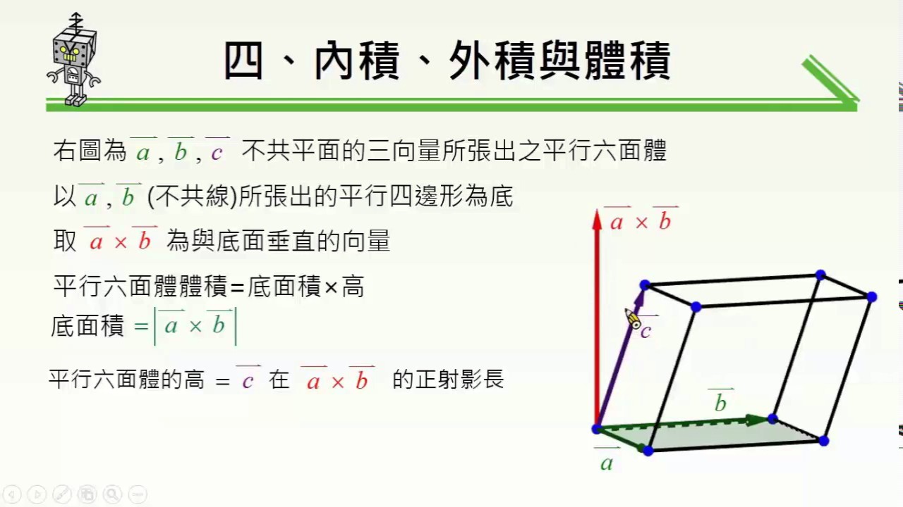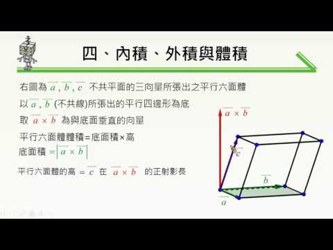 載入中... 相關課程 Back 【觀念】利用外積求平行六面體體積 相關課程 0 / 750 登入觀看 ⇐ Use this menu to view and help create subtitles for this video in many different languages. You'll probably want to hide YouTube's captions if using these subtitles. 【觀念】利用外積求平行六面體體積 上傳學習單 下載學習單