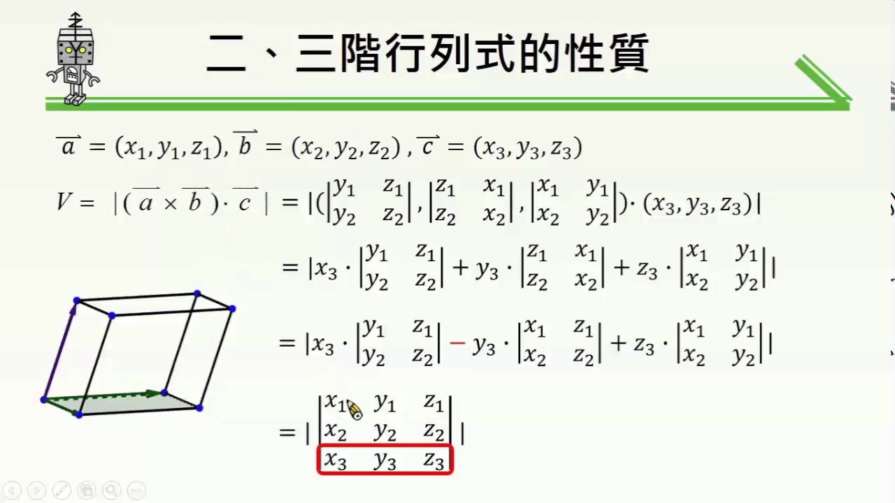 載入中... 相關課程 Back 【觀念】三階行列式與平行六面體體積 相關課程 0 / 750 登入觀看 ⇐ Use this menu to view and help create subtitles for this video in many different languages. You'll probably want to hide YouTube's captions if using these subtitles. 【觀念】三階行列式與平行六面體體積 上傳學習單 下載學習單