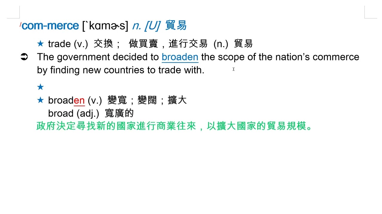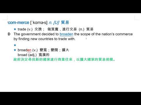 載入中... 相關課程 Back commerce [`kɑmɚs] n. [U] 貿易 相關課程 0 / 750 登入觀看 ⇐ Use this menu to view and help create subtitles for this video in many different languages. You'll probably want to hide YouTube's captions if using these subtitles. commerce [`kɑmɚs] n. [U] 貿易 上傳學習單 下載學習單