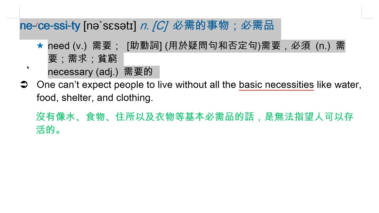載入中... 相關課程 Back necessity [nə`sɛsətɪ] n. [C] 必需的事物;必需品 相關課程 0 / 750 登入觀看 ⇐ Use this menu to view and help create subtitles for this video in many different languages. You'll probably want to hide YouTube's captions if using these subtitles. necessity [nə`sɛsətɪ] n. [C] 必需的事物;必需品 上傳學習單 下載學習單