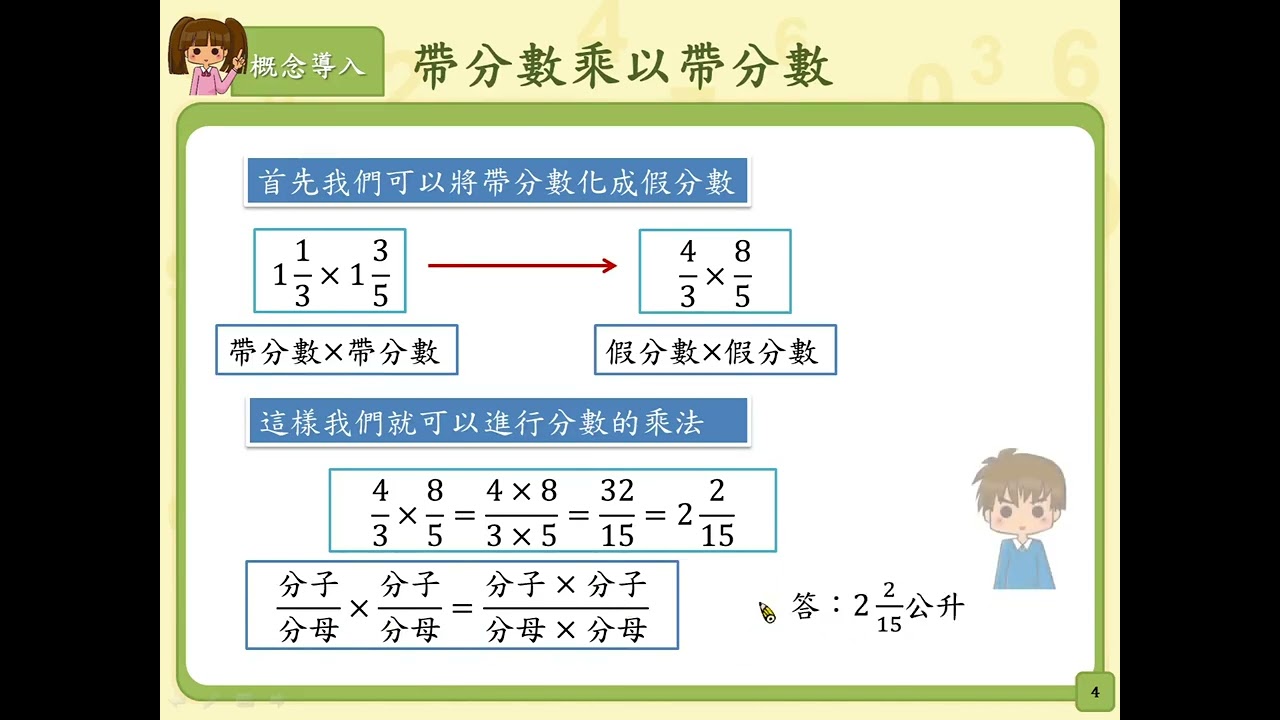 載入中... 相關課程 Back N-5-5-S05:能理解帶分數乘以帶分數的意義。 相關課程 0 / 750 登入觀看 ⇐ Use this menu to view and help create subtitles for this video in many different languages. You'll probably want to hide YouTube's captions if using these subtitles. N-5-5-S05:能理解帶分數乘以帶分數的意義。 上傳學習單 下載學習單