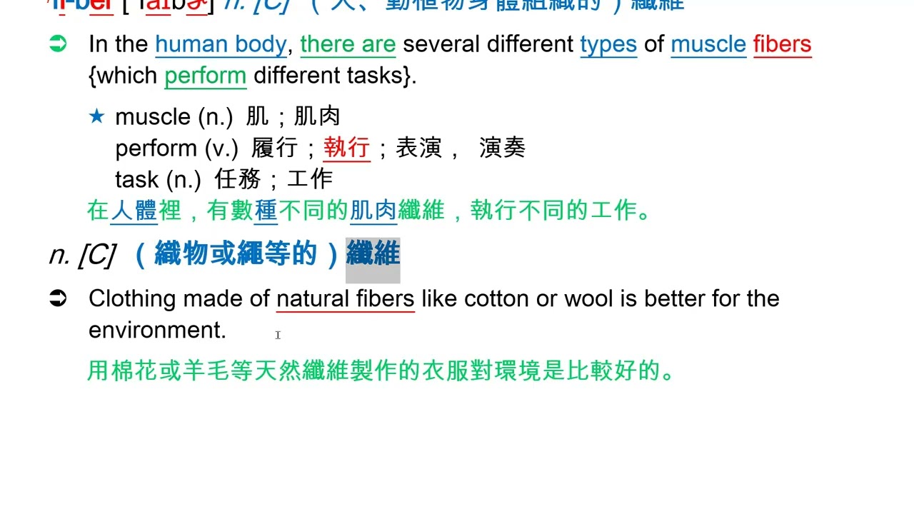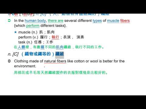 載入中... 相關課程 Back fiber [`faɪbɚ] n. [C] (人、動植物身體組織的)纖維 相關課程 0 / 750 登入觀看 ⇐ Use this menu to view and help create subtitles for this video in many different languages. You'll probably want to hide YouTube's captions if using these subtitles. fiber [`faɪbɚ] n. [C] (人、動植物身體組織的)纖維 上傳學習單 下載學習單