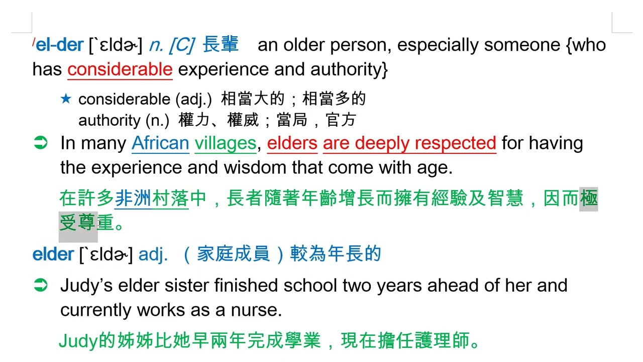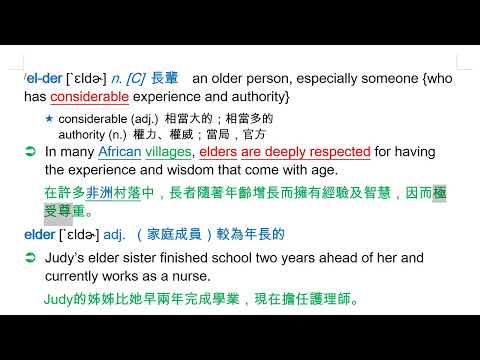 載入中... 相關課程 Back elder [`ɛldɚ] n. [C] 長輩 相關課程 0 / 750 登入觀看 ⇐ Use this menu to view and help create subtitles for this video in many different languages. You'll probably want to hide YouTube's captions if using these subtitles. elder [`ɛldɚ] n. [C] 長輩 上傳學習單 下載學習單