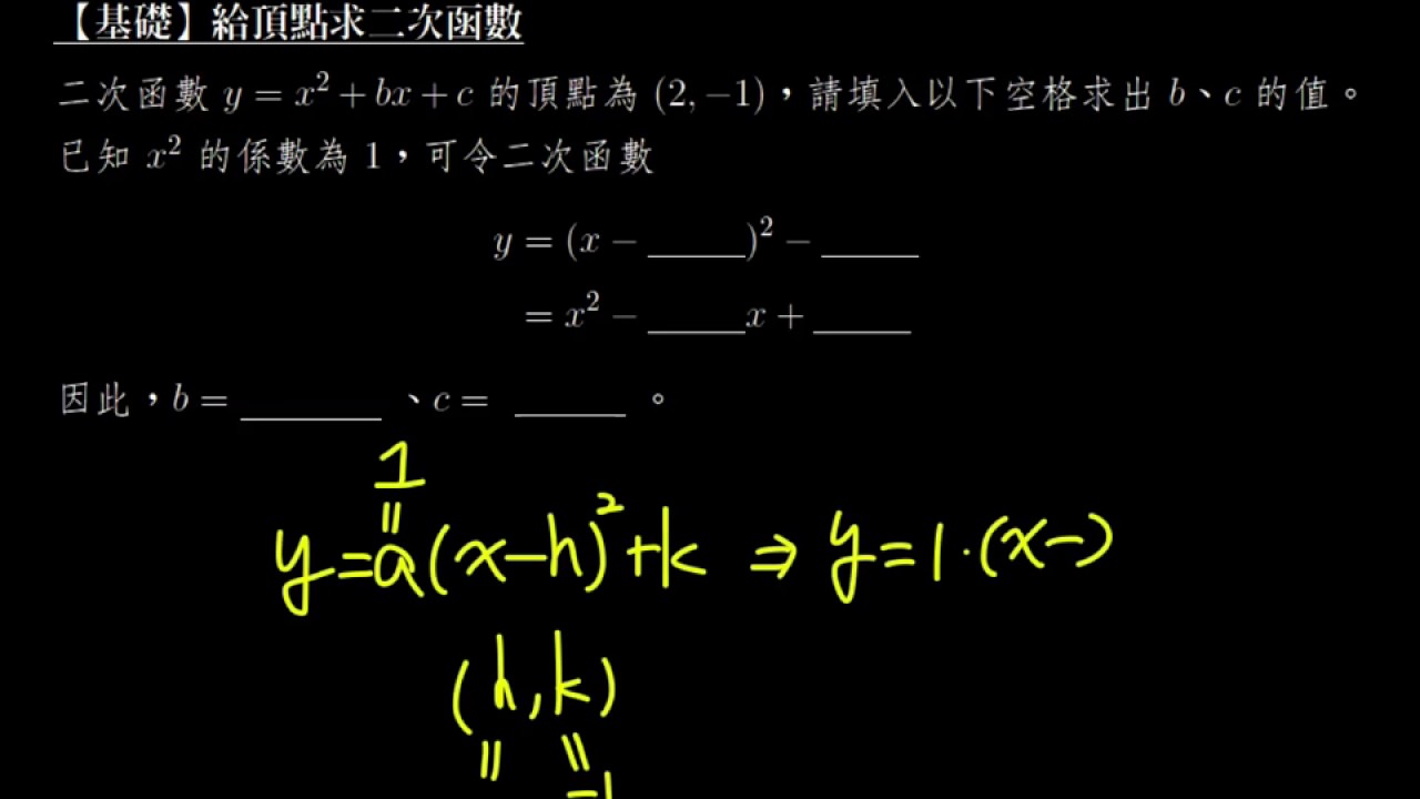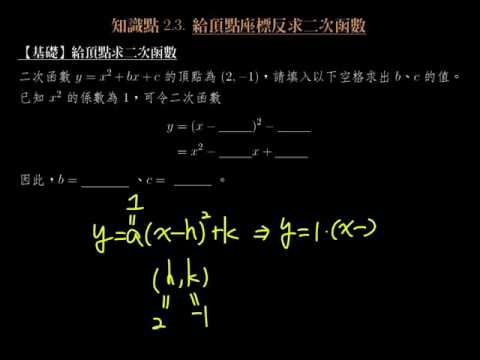 載入中... 相關課程 Back 【例題】頂點 (2,-1) 求二次函數 y=x^2+bx+c 相關課程 0 / 750 登入觀看 ⇐ Use this menu to view and help create subtitles for this video in many different languages. You'll probably want to hide YouTube's captions if using these subtitles. 【例題】頂點 (2,-1) 求二次函數 y=x^2+bx+c 上傳學習單 下載學習單