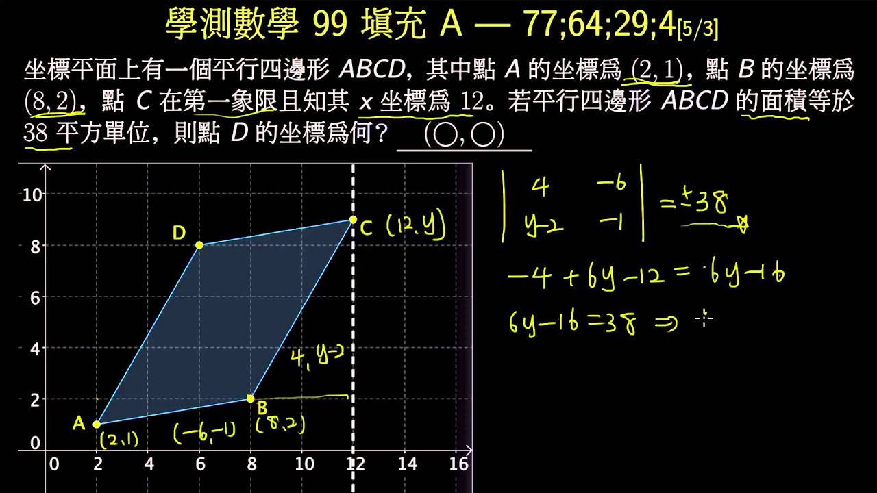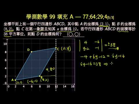 載入中... 相關課程 Back 學測數學99_填充A_給平行四邊形面積求坐標 相關課程 0 / 750 登入觀看 ⇐ Use this menu to view and help create subtitles for this video in many different languages. You'll probably want to hide YouTube's captions if using these subtitles. 學測數學99_填充A_給平行四邊形面積求坐標 上傳學習單 下載學習單