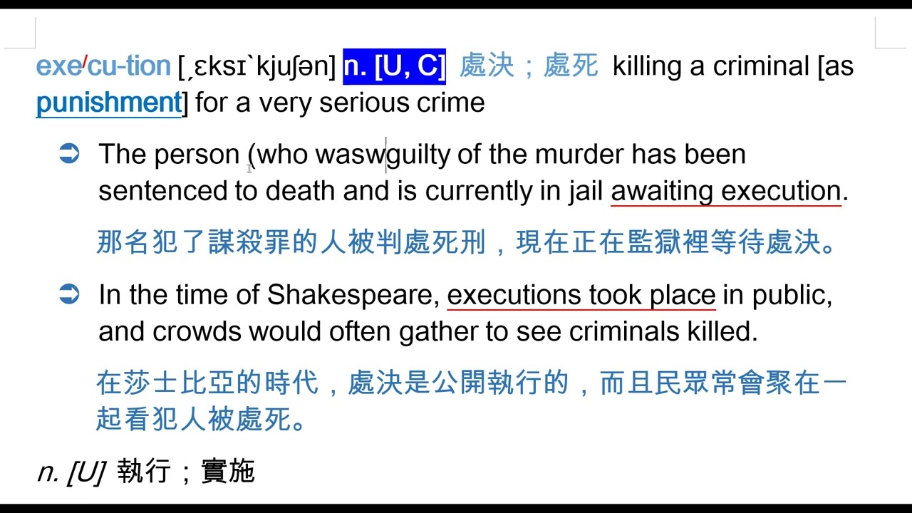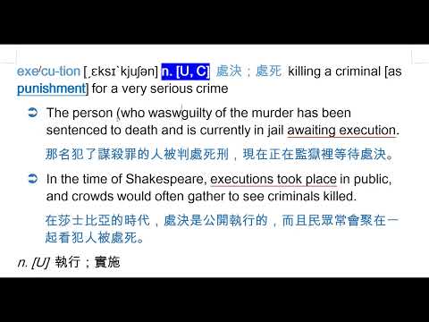 載入中... 相關課程 Back execution [ˏɛksɪ`kjuʃən] n. [U, C] 處決;處死 相關課程 0 / 750 登入觀看 ⇐ Use this menu to view and help create subtitles for this video in many different languages. You'll probably want to hide YouTube's captions if using these subtitles. execution [ˏɛksɪ`kjuʃən] n. [U, C] 處決;處死 上傳學習單 下載學習單