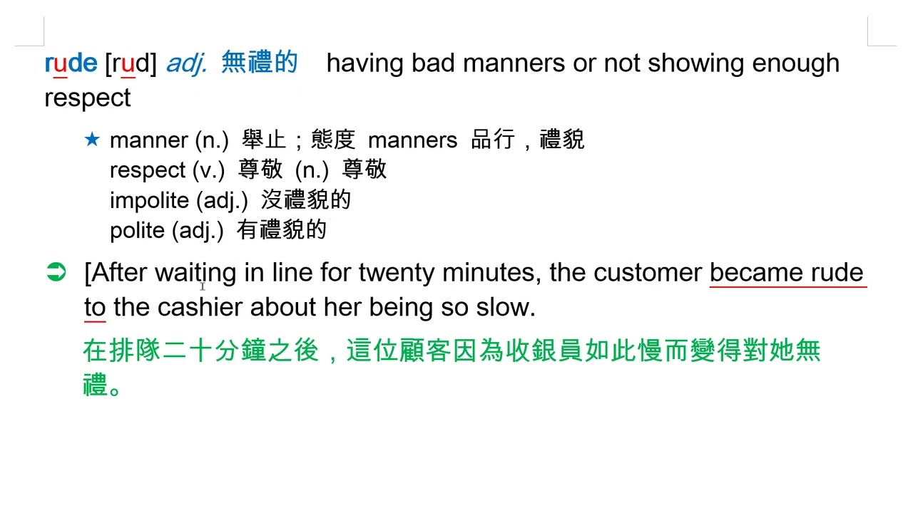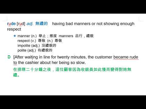 載入中... 相關課程 Back rude [rud] adj. 無禮的 相關課程 0 / 750 登入觀看 ⇐ Use this menu to view and help create subtitles for this video in many different languages. You'll probably want to hide YouTube's captions if using these subtitles. rude [rud] adj. 無禮的 上傳學習單 下載學習單