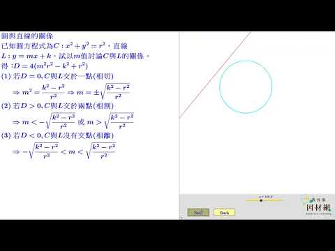 載入中... 相關課程 Back G-10-4-S04_能利用解聯立方程式的代數方法判斷圓與直線的關係 相關課程 0 / 750 登入觀看 ⇐ Use this menu to view and help create subtitles for this video in many different languages. You'll probably want to hide YouTube's captions if using these subtitles. G-10-4-S04_能利用解聯立方程式的代數方法判斷圓與直線的關係 上傳學習單 下載學習單