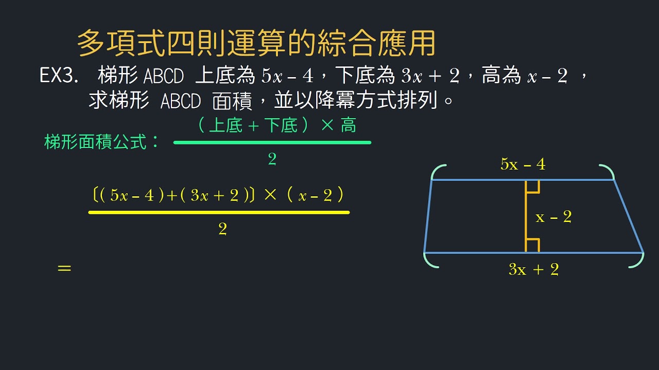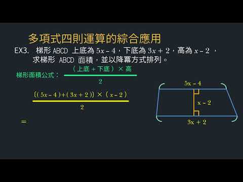 載入中... 相關課程 Back 【例題】以多項式表示梯形面積 相關課程 0 / 750 登入觀看 ⇐ Use this menu to view and help create subtitles for this video in many different languages. You'll probably want to hide YouTube's captions if using these subtitles. 【例題】以多項式表示梯形面積 上傳學習單 下載學習單