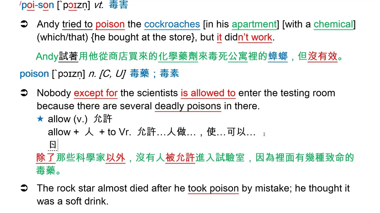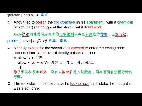 載入中... 相關課程 Back poisonous [`pɔɪznəs] adj. 有毒的 相關課程 0 / 750 登入觀看 ⇐ Use this menu to view and help create subtitles for this video in many different languages. You'll probably want to hide YouTube's captions if using these subtitles. poisonous [`pɔɪznəs] adj. 有毒的 上傳學習單 下載學習單