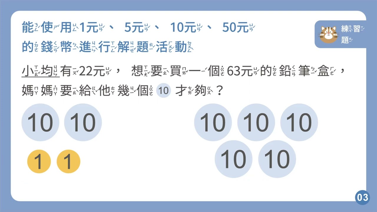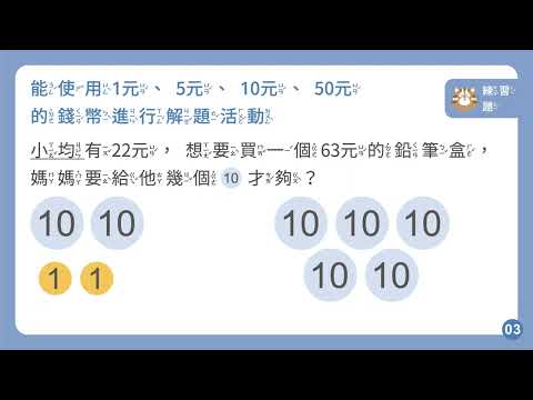 載入中... 相關課程 Back 【解題】能使用1元、5元、10元、50元的錢幣進行解題活動 相關課程 0 / 750 登入觀看 ⇐ Use this menu to view and help create subtitles for this video in many different languages. You'll probably want to hide YouTube's captions if using these subtitles. 【解題】能使用1元、5元、10元、50元的錢幣進行解題活動 上傳學習單 下載學習單