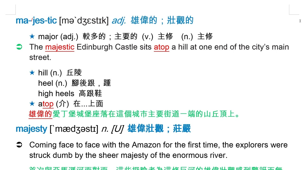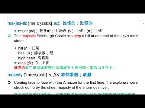 載入中... 相關課程 Back majestic [mə`dʒɛstɪk] adj. 雄偉的;壯觀的 相關課程 0 / 750 登入觀看 ⇐ Use this menu to view and help create subtitles for this video in many different languages. You'll probably want to hide YouTube's captions if using these subtitles. majestic [mə`dʒɛstɪk] adj. 雄偉的;壯觀的 上傳學習單 下載學習單