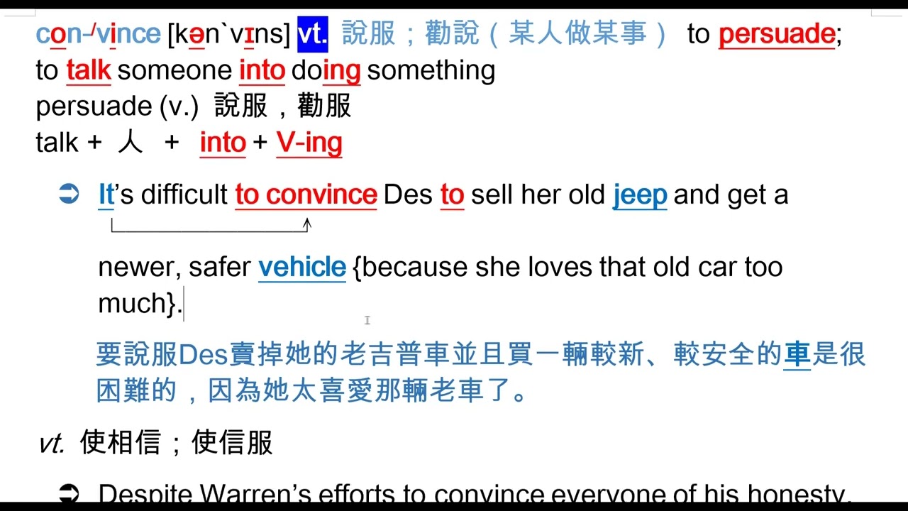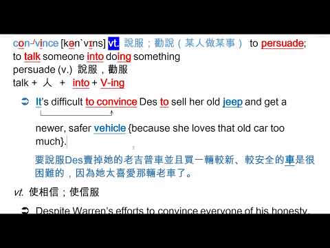 載入中... 相關課程 Back convince [kən`vɪns] vt. 說服;勸說(某人做某事) 相關課程 0 / 750 登入觀看 ⇐ Use this menu to view and help create subtitles for this video in many different languages. You'll probably want to hide YouTube's captions if using these subtitles. convince [kən`vɪns] vt. 說服;勸說(某人做某事) : talk + 人 + into + V-ing persuade 上傳學習單 下載學習單