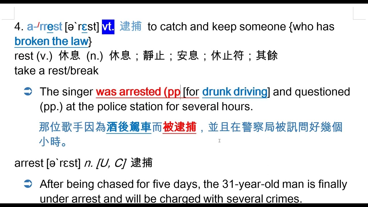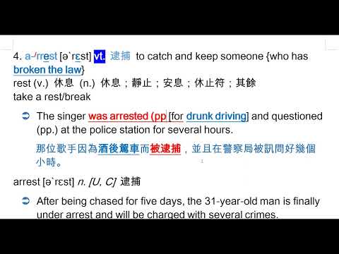 載入中... 相關課程 Back arrest [ə`rɛst] vt. 逮捕 相關課程 0 / 750 登入觀看 ⇐ Use this menu to view and help create subtitles for this video in many different languages. You'll probably want to hide YouTube's captions if using these subtitles. arrest [ə`rɛst] vt. 逮捕 : arrest [ə`rɛst] n. [U, C] 逮捕 人 + be under arrest 被逮捕 上傳學習單 下載學習單
