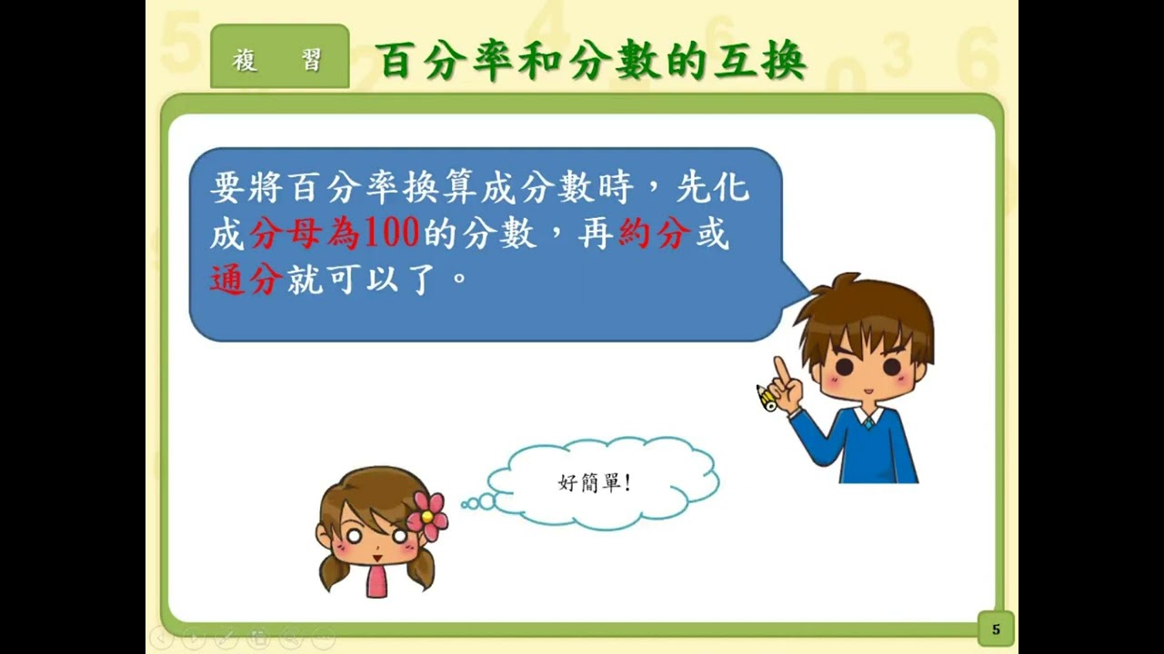載入中... 相關課程 Back N-5-10-S06:能熟練常用百分率和分數的互換。 相關課程 0 / 750 登入觀看 ⇐ Use this menu to view and help create subtitles for this video in many different languages. You'll probably want to hide YouTube's captions if using these subtitles. N-5-10-S06:能熟練常用百分率和分數的互換。 上傳學習單 下載學習單