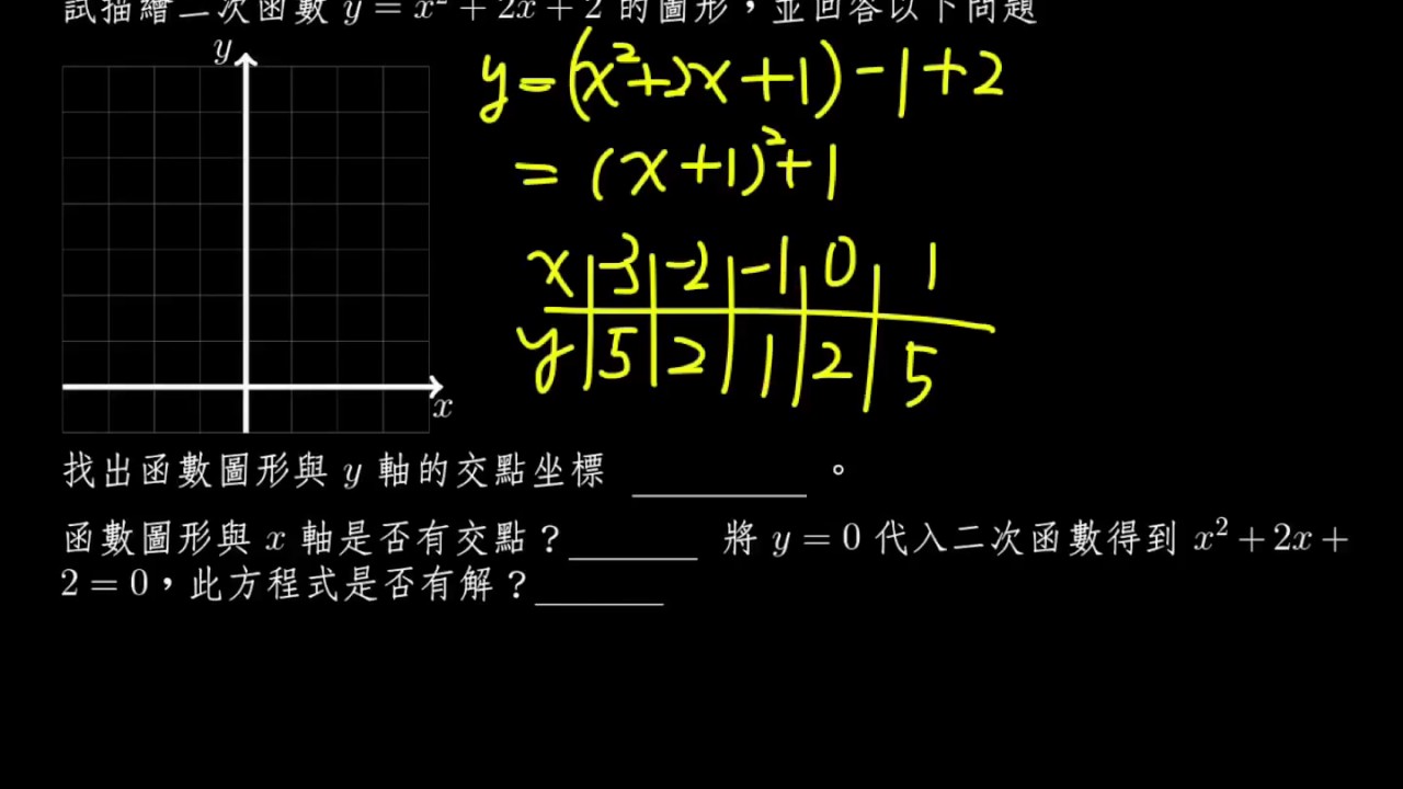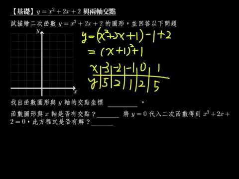 載入中... 相關課程 Back 【例題】y=x^2+2x+2 與兩軸交點 相關課程 0 / 750 登入觀看 ⇐ Use this menu to view and help create subtitles for this video in many different languages. You'll probably want to hide YouTube's captions if using these subtitles. 【例題】y=x^2+2x+2 與兩軸交點 上傳學習單 下載學習單