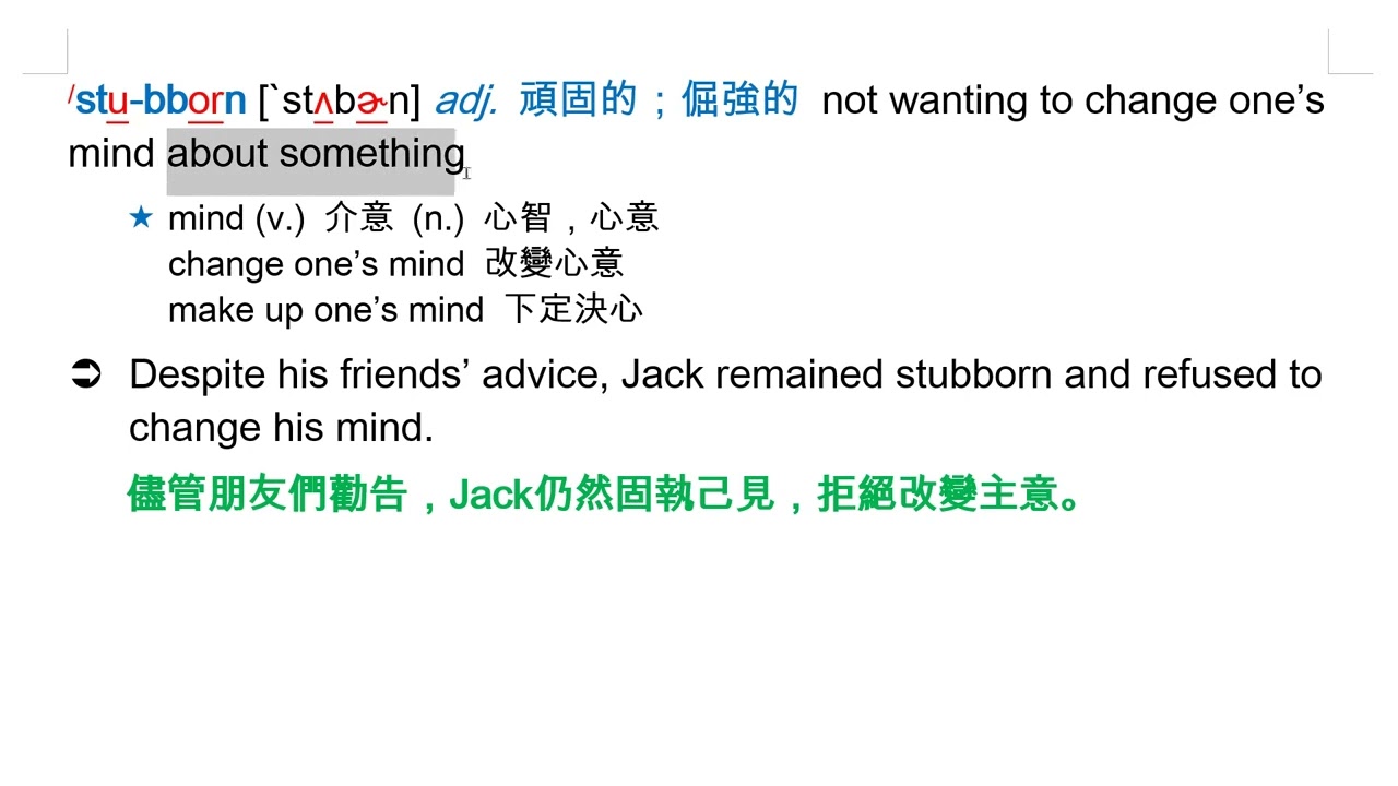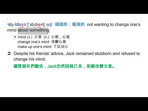 載入中... 相關課程 Back stubborn [ˋstʌbɚn] adj. 頑固的;倔強的 相關課程 0 / 750 登入觀看 ⇐ Use this menu to view and help create subtitles for this video in many different languages. You'll probably want to hide YouTube's captions if using these subtitles. stubborn [ˋstʌbɚn] adj. 頑固的;倔強的 上傳學習單 下載學習單
