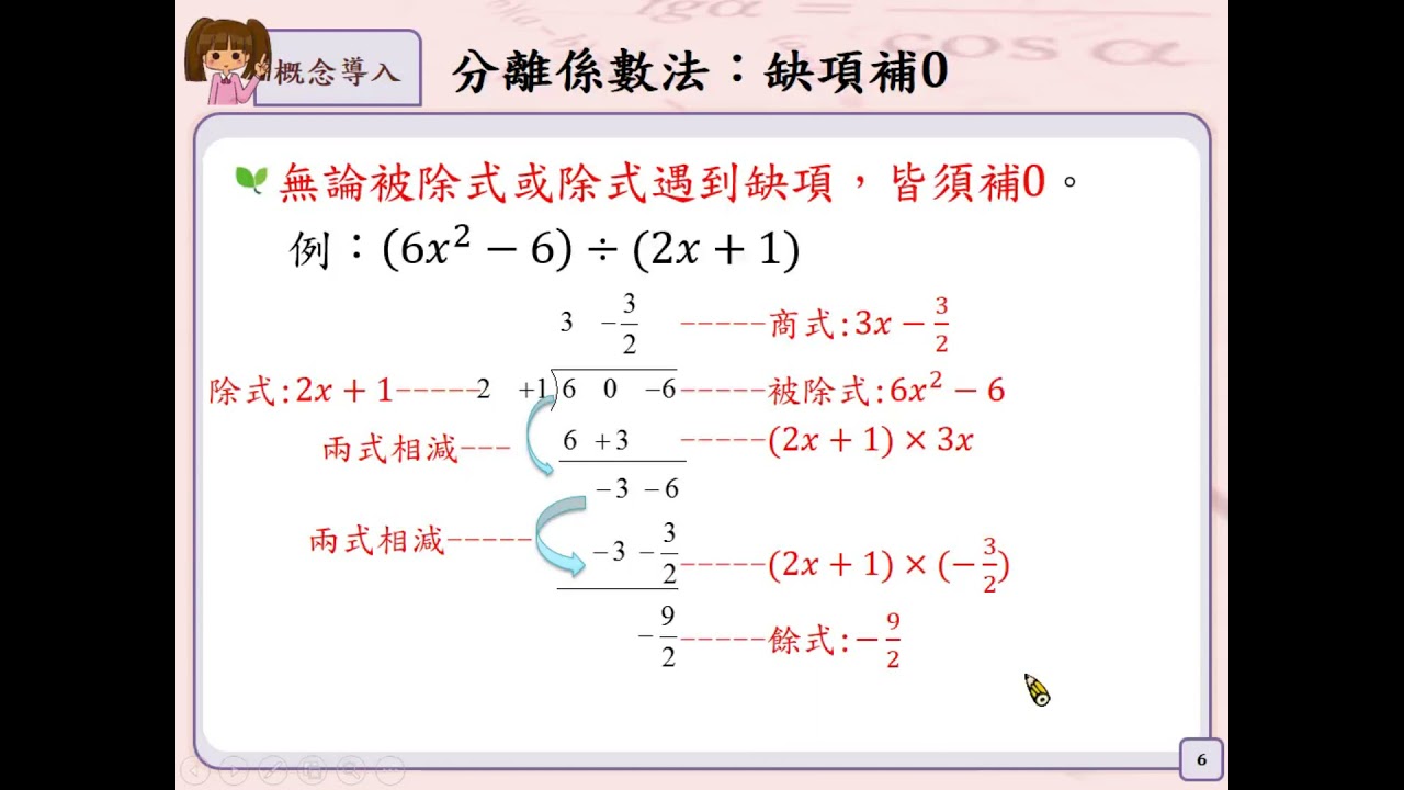 載入中... 相關課程 Back A-8-3-S05_能利用分離係數法來熟練被除式為二次之多項式除法運算。 相關課程 0 / 750 登入觀看 ⇐ Use this menu to view and help create subtitles for this video in many different languages. You'll probably want to hide YouTube's captions if using these subtitles. A-8-3-S05_能利用分離係數法來熟練被除式為二次之多項式除法運算。 上傳學習單 下載學習單