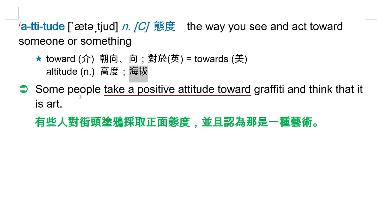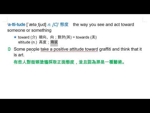 載入中... 相關課程 Back attitude [`ætəˏtjud] n. [C] 態度 相關課程 0 / 750 登入觀看 ⇐ Use this menu to view and help create subtitles for this video in many different languages. You'll probably want to hide YouTube's captions if using these subtitles. attitude [`ætəˏtjud] n. [C] 態度 上傳學習單 下載學習單