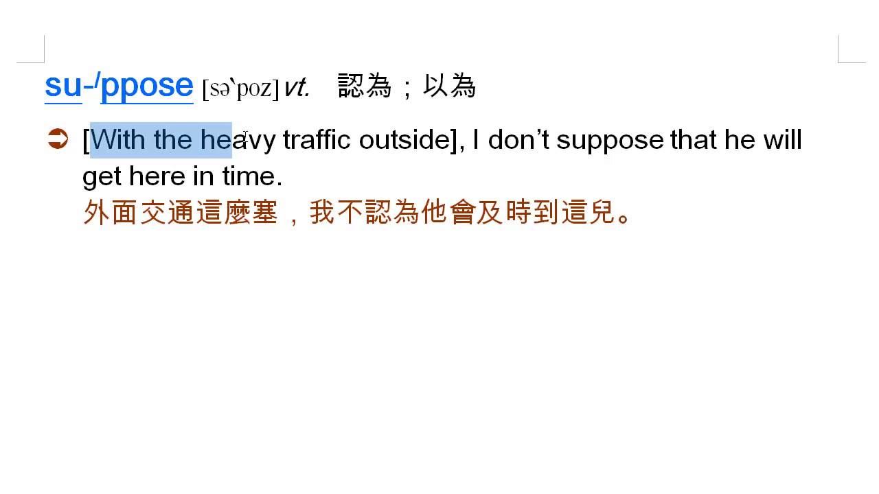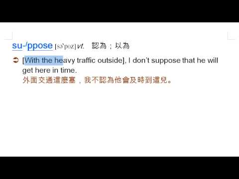 載入中... 相關課程 Back suppose: 以為, 認為 相關課程 0 / 750 登入觀看 ⇐ Use this menu to view and help create subtitles for this video in many different languages. You'll probably want to hide YouTube's captions if using these subtitles. suppose: 以為, 認為 上傳學習單 下載學習單