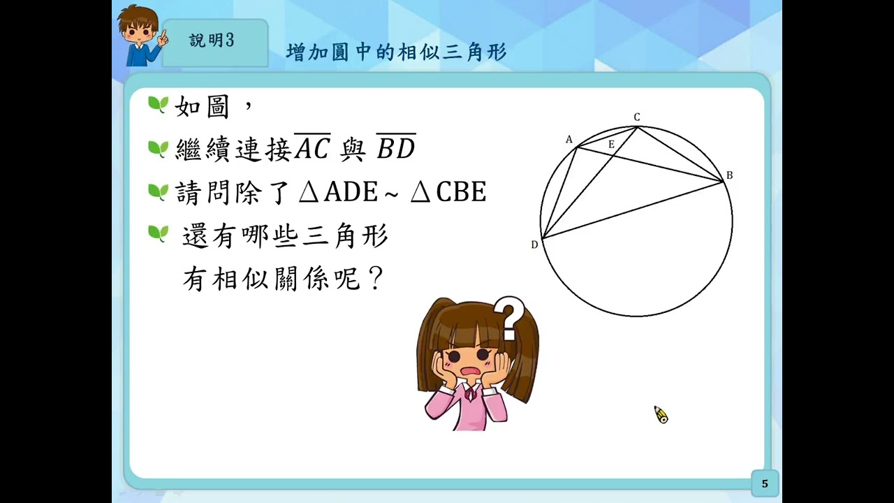 載入中... 相關課程 Back S-9-2-S05 在圓中,能利用兩弦相交來做出或找出相似三角形 相關課程 0 / 750 登入觀看 ⇐ Use this menu to view and help create subtitles for this video in many different languages. You'll probably want to hide YouTube's captions if using these subtitles. S-9-2-S05 在圓中,能利用兩弦相交來做出或找出相似三角形 上傳學習單 下載學習單