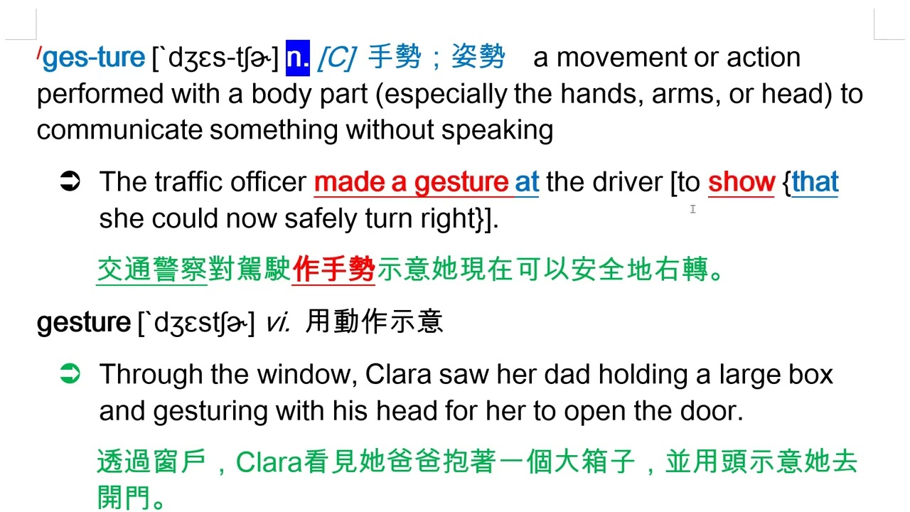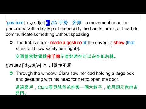 載入中... 相關課程 Back gesture [`dʒɛs-tʃɚ] n. [C] 手勢;姿勢 vi. 用動作示意 相關課程 0 / 750 登入觀看 ⇐ Use this menu to view and help create subtitles for this video in many different languages. You'll probably want to hide YouTube's captions if using these subtitles. gesture [`dʒɛs-tʃɚ] n. [C] 手勢;姿勢 vi. 用動作示意 上傳學習單 下載學習單