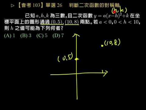 載入中... 相關課程 Back 【進階】會考103單選26 判斷二次函數的對稱軸 相關課程 0 / 750 登入觀看 ⇐ Use this menu to view and help create subtitles for this video in many different languages. You'll probably want to hide YouTube's captions if using these subtitles. 【進階】會考103單選26 判斷二次函數的對稱軸 上傳學習單 下載學習單