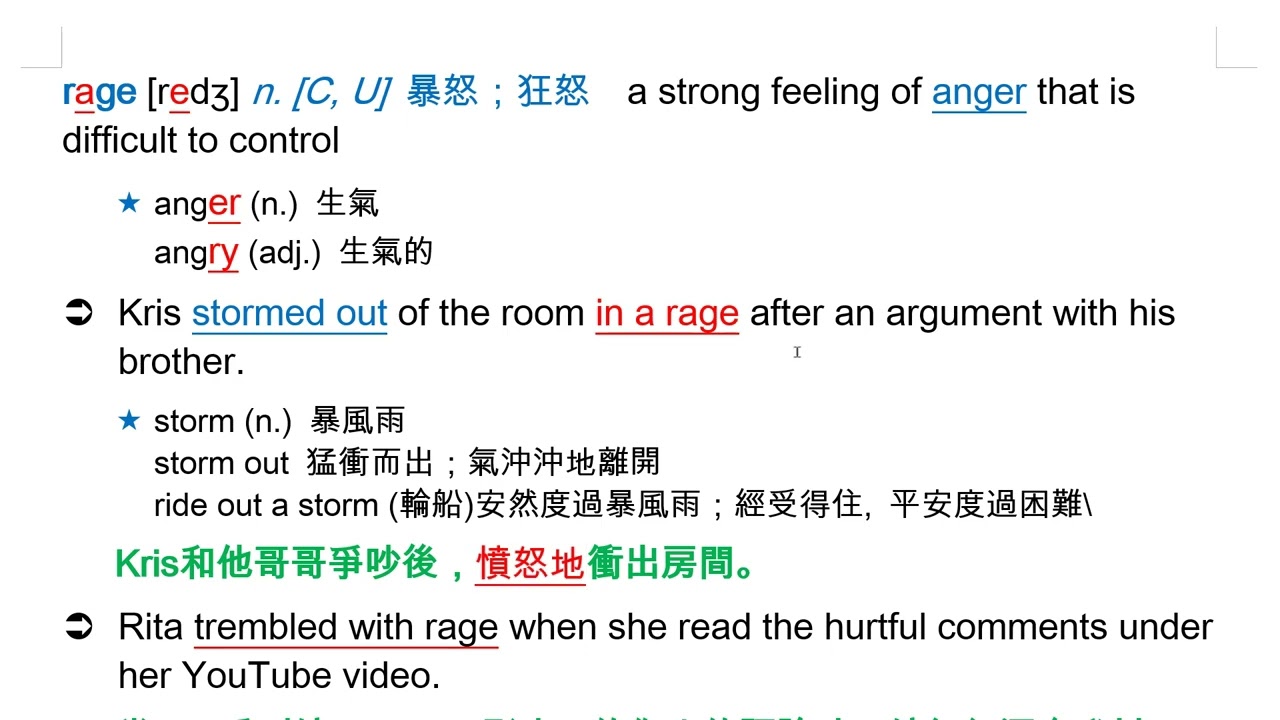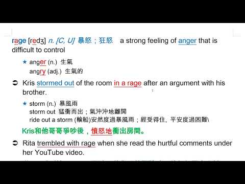 載入中... 相關課程 Back rage [redʒ] n. [C, U] 暴怒;狂怒 相關課程 0 / 750 登入觀看 ⇐ Use this menu to view and help create subtitles for this video in many different languages. You'll probably want to hide YouTube's captions if using these subtitles. rage [redʒ] n. [C, U] 暴怒;狂怒 上傳學習單 下載學習單
