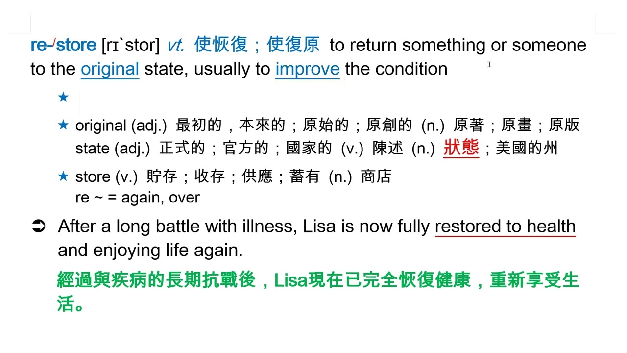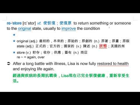 載入中... 相關課程 Back restore [rɪˋstor] vt. 使恢復;使復原 相關課程 0 / 750 登入觀看 ⇐ Use this menu to view and help create subtitles for this video in many different languages. You'll probably want to hide YouTube's captions if using these subtitles. restore [rɪˋstor] vt. 使恢復;使復原 上傳學習單 下載學習單