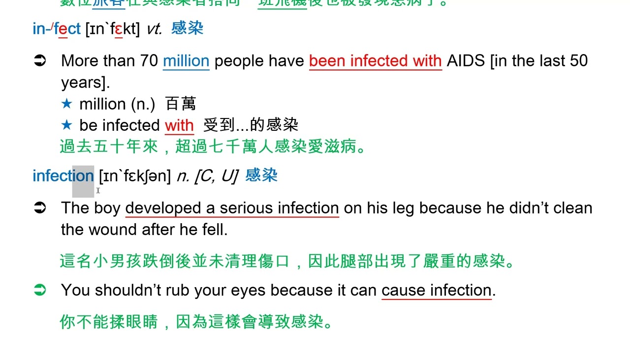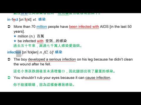 載入中... 相關課程 Back infected [ɪn`fɛktɪd] adj. 遭感染的 相關課程 0 / 750 登入觀看 ⇐ Use this menu to view and help create subtitles for this video in many different languages. You'll probably want to hide YouTube's captions if using these subtitles. infected [ɪn`fɛktɪd] adj. 遭感染的 上傳學習單 下載學習單
