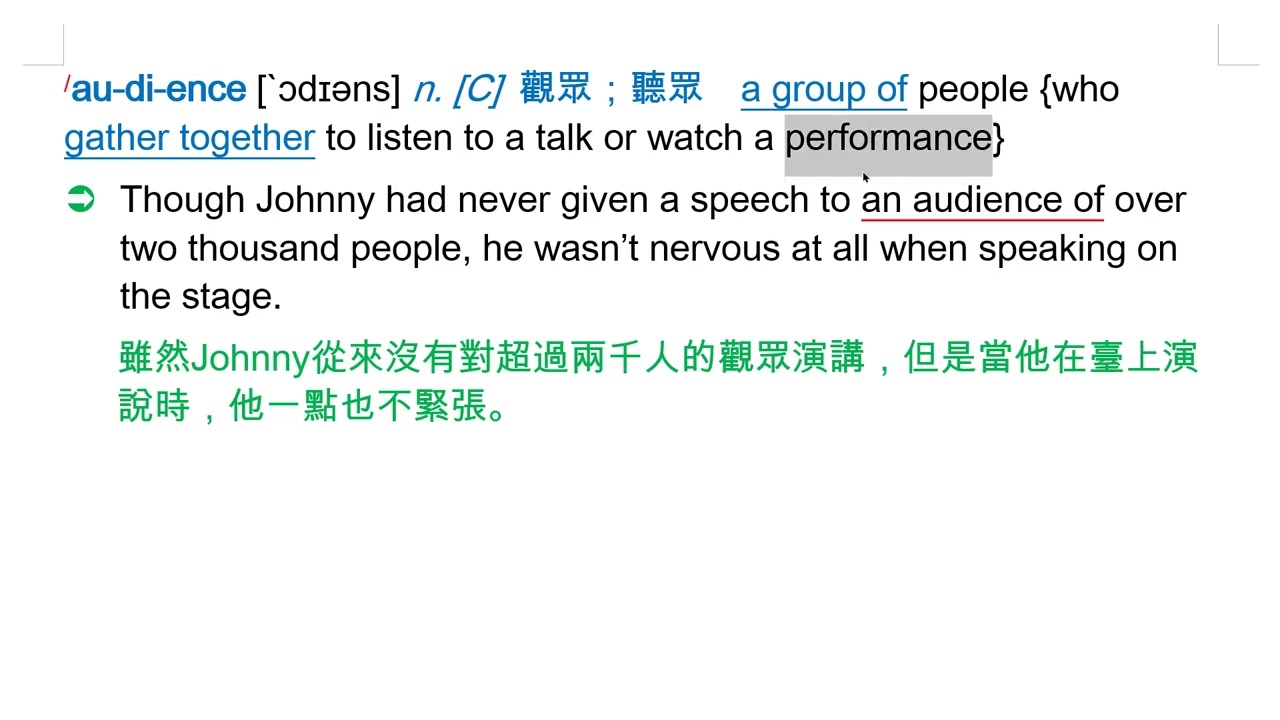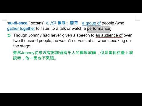 載入中... 相關課程 Back audience [`ɔdɪəns] n. [C] 觀眾;聽眾 相關課程 0 / 750 登入觀看 audience [`ɔdɪəns] n. [C] 觀眾;聽眾 上傳學習單 下載學習單