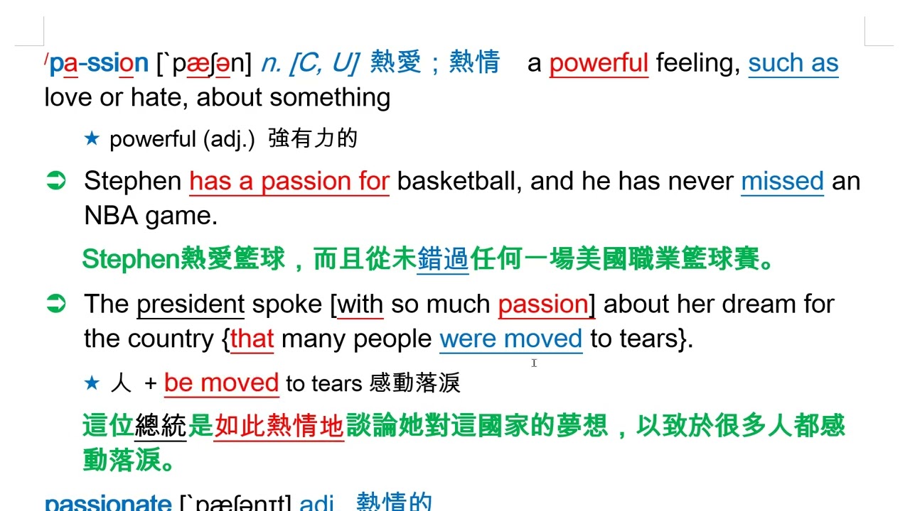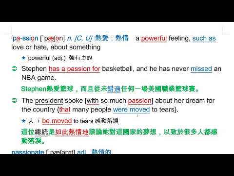 載入中... 相關課程 Back passion [`pæʃən] n. [C, U] 熱愛;熱情 相關課程 0 / 750 登入觀看 ⇐ Use this menu to view and help create subtitles for this video in many different languages. You'll probably want to hide YouTube's captions if using these subtitles. passion [`pæʃən] n. [C, U] 熱愛;熱情 上傳學習單 下載學習單
