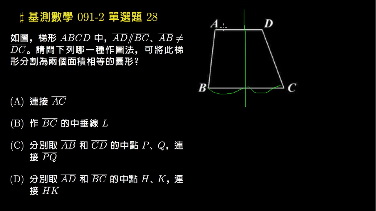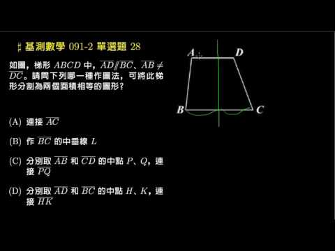 載入中... 相關課程 Back 【基測數學】91v2 單選28:將梯形等分 相關課程 0 / 750 登入觀看 ⇐ Use this menu to view and help create subtitles for this video in many different languages. You'll probably want to hide YouTube's captions if using these subtitles. 【基測數學】91v2 單選28:將梯形等分 上傳學習單 下載學習單