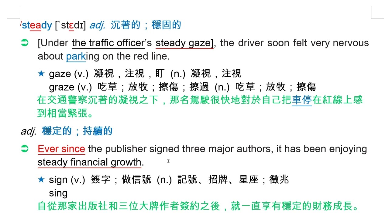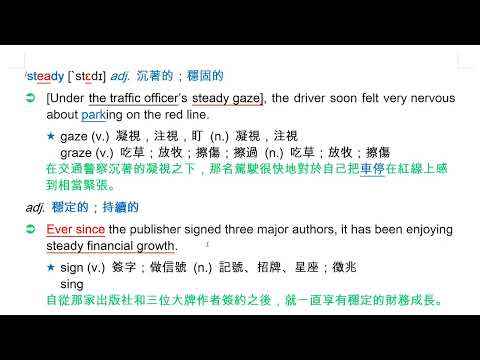 載入中... 相關課程 Back steady [`stɛdɪ] adj. 沉著的;穩固的 相關課程 0 / 750 登入觀看 ⇐ Use this menu to view and help create subtitles for this video in many different languages. You'll probably want to hide YouTube's captions if using these subtitles. steady [`stɛdɪ] adj. 沉著的;穩固的 上傳學習單 下載學習單