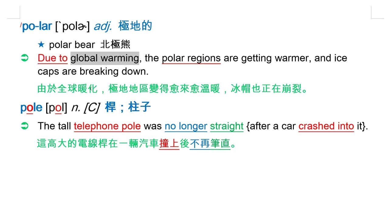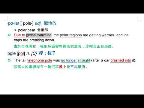 載入中... 相關課程 Back polar [`polɚ] adj. 極地的 相關課程 0 / 750 登入觀看 ⇐ Use this menu to view and help create subtitles for this video in many different languages. You'll probably want to hide YouTube's captions if using these subtitles. polar [`polɚ] adj. 極地的 上傳學習單 下載學習單