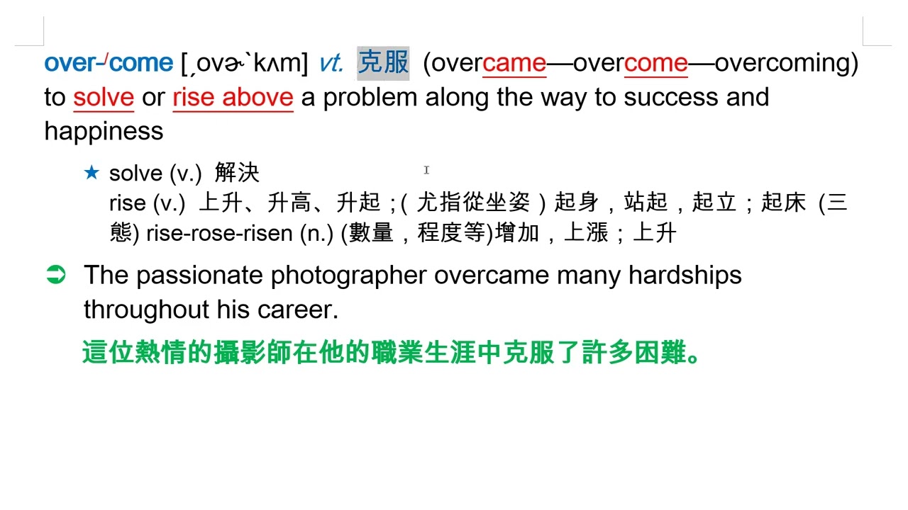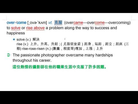 載入中... 相關課程 Back overcome [ˏovɚ`kʌm] vt. 克服 相關課程 0 / 750 登入觀看 ⇐ Use this menu to view and help create subtitles for this video in many different languages. You'll probably want to hide YouTube's captions if using these subtitles. overcome [ˏovɚ`kʌm] vt. 克服 上傳學習單 下載學習單