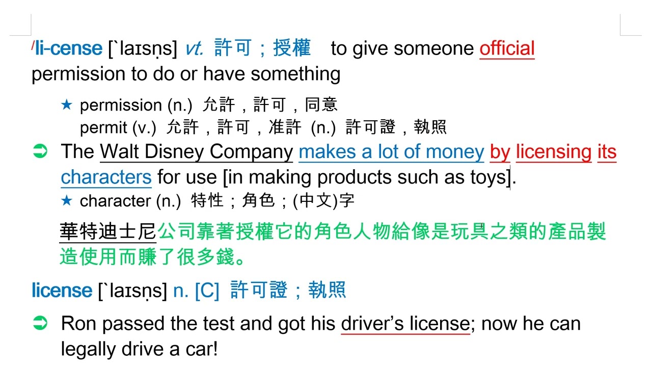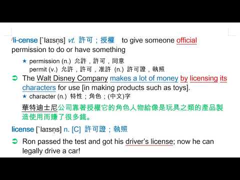 載入中... 相關課程 Back license [`laɪsṇs] vt. 許可;授權 相關課程 0 / 750 登入觀看 ⇐ Use this menu to view and help create subtitles for this video in many different languages. You'll probably want to hide YouTube's captions if using these subtitles. license [`laɪsṇs] vt. 許可;授權 上傳學習單 下載學習單
