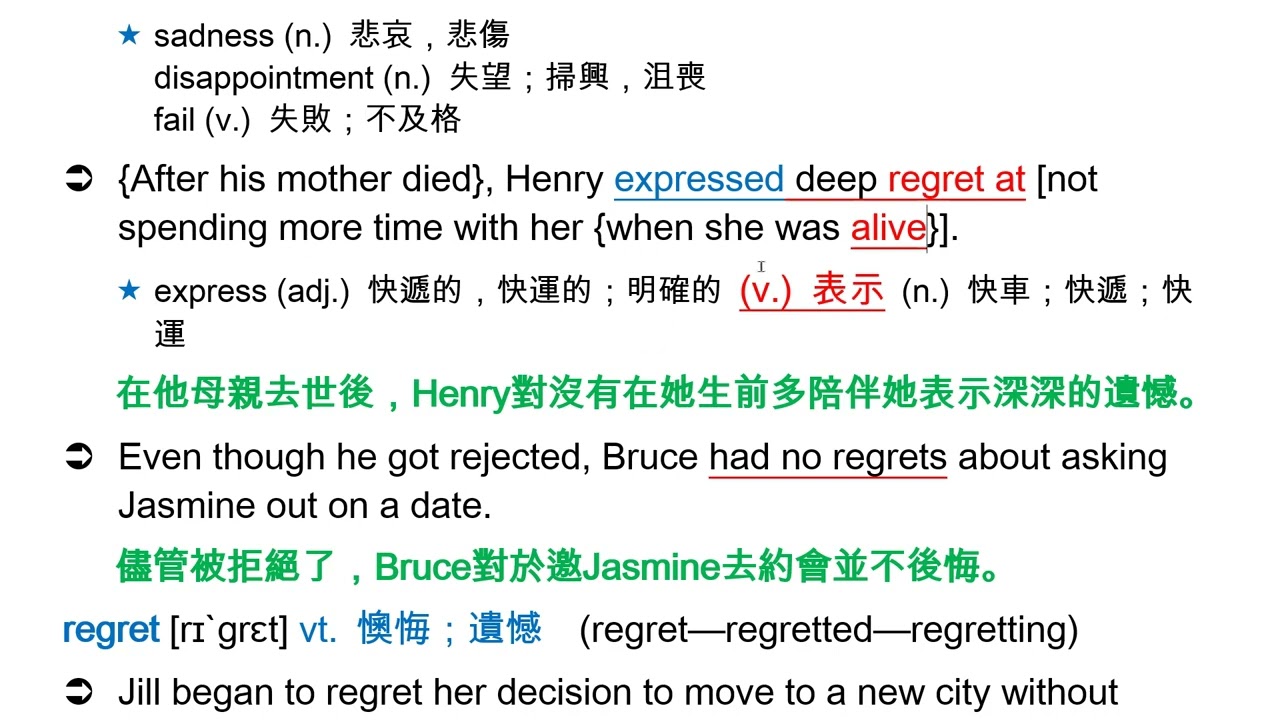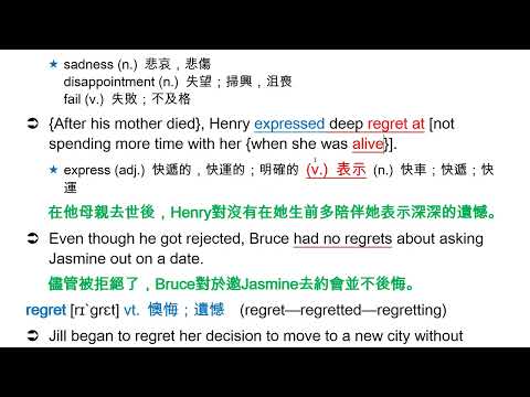 載入中... 相關課程 Back regret [rɪˋgrɛt] n. [U, C] 懊悔;遺憾 相關課程 0 / 750 登入觀看 ⇐ Use this menu to view and help create subtitles for this video in many different languages. You'll probably want to hide YouTube's captions if using these subtitles. regret [rɪˋgrɛt] n. [U, C] 懊悔;遺憾 上傳學習單 下載學習單