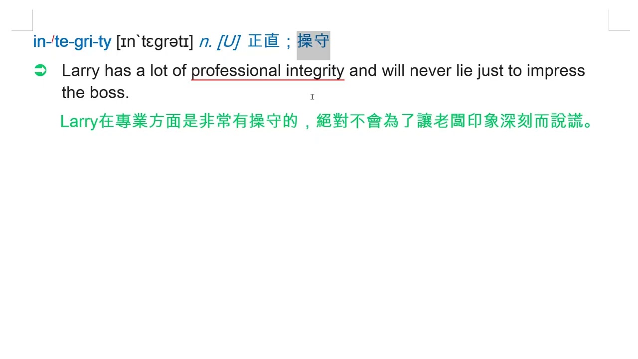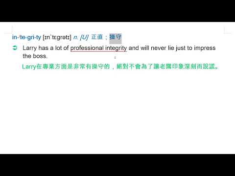 載入中... 相關課程 Back integrity [ɪn`tɛgrətɪ] n. [U] 正直;操守 相關課程 0 / 750 登入觀看 ⇐ Use this menu to view and help create subtitles for this video in many different languages. You'll probably want to hide YouTube's captions if using these subtitles. integrity [ɪn`tɛgrətɪ] n. [U] 正直;操守 上傳學習單 下載學習單