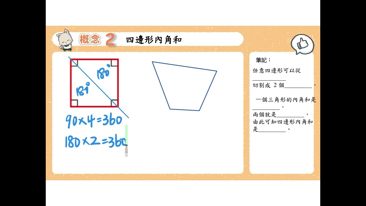 載入中... 相關課程 Back 概念2 四邊形內角和 相關課程 0 / 750 登入觀看 ⇐ Use this menu to view and help create subtitles for this video in many different languages. You'll probably want to hide YouTube's captions if using these subtitles. 概念2 四邊形內角和 上傳學習單 下載學習單