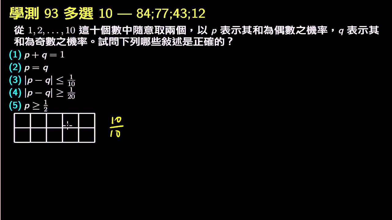載入中... 相關課程 Back 學測數學93 多選10 抽兩球和為偶數 相關課程 0 / 750 登入觀看 ⇐ Use this menu to view and help create subtitles for this video in many different languages. You'll probably want to hide YouTube's captions if using these subtitles. 學測數學93 多選10 抽兩球和為偶數 上傳學習單 下載學習單